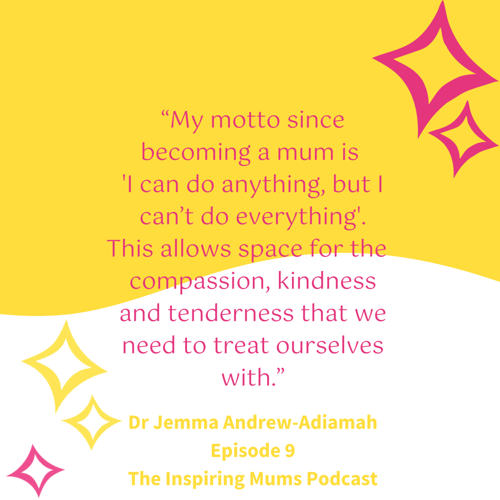 - “My advice to a mum who feels overwhelmed and exhausted would be: be gentle with yourself, be kind to yourself and break your day down into hour by hour.” – Dr Jemma Andrew-Adiamah