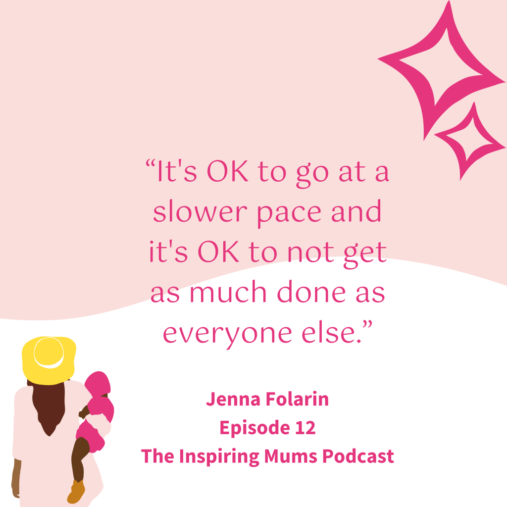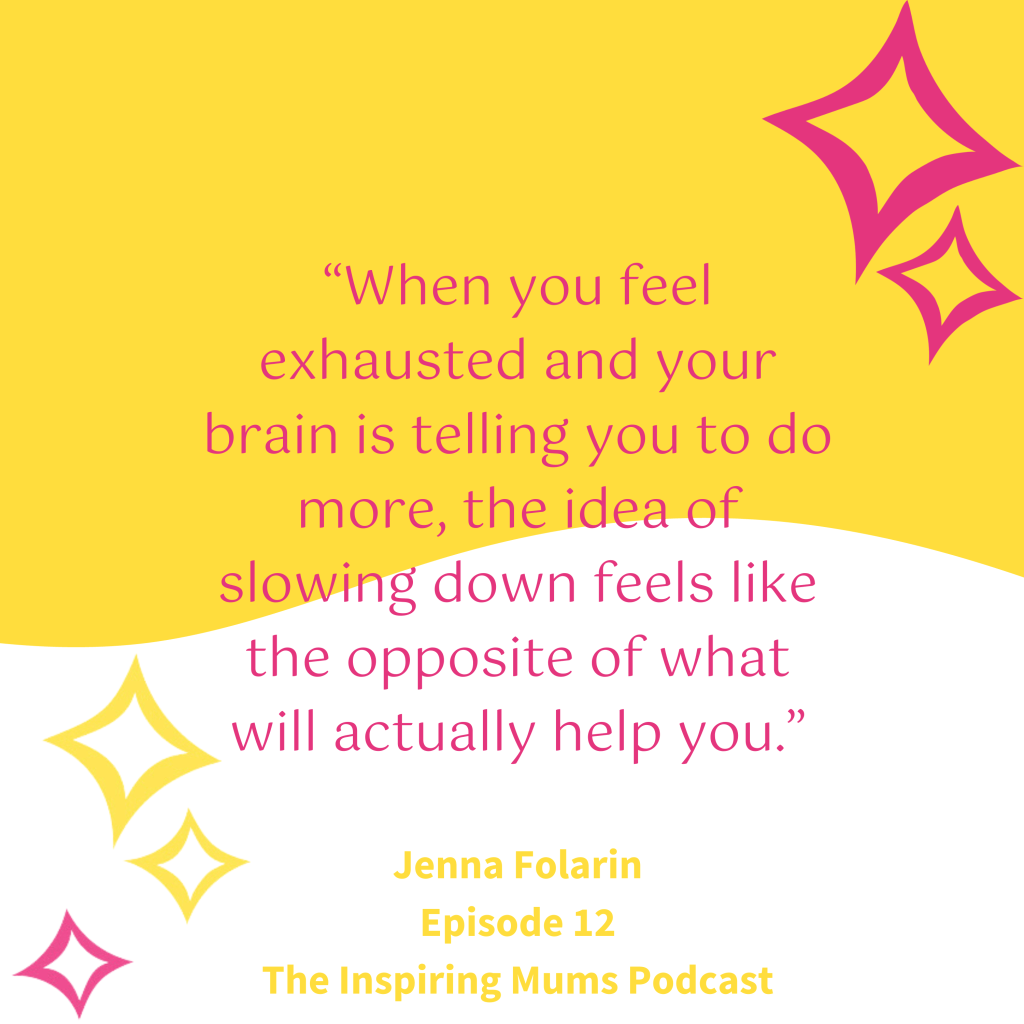 - “Slowing down for you might look like lowering your expectations of what you can actually do with the time you’ve got available.” – Jenna Folarin